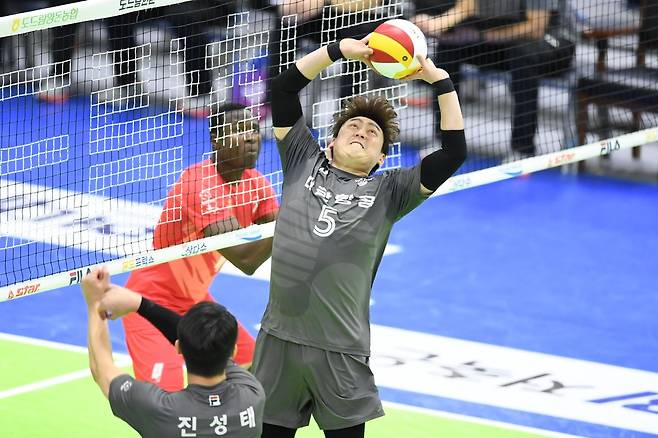 (서울=연합뉴스) 13일 경기도 수원실내체육관에서 열린 프로배구 V리그 남자부 한국전력 빅스톰과 대한항공 점보스의 경기. 대한항공 세터 유광우가 공을 올리고 있다. 2022.1.13 [한국배구연맹 제공. 재배포 및 DB금지]