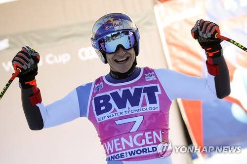 Switzerland's Marco Odermatt celebrates at the finish area of an alpine ski, men's World Cup super G, in Wengen, Switzerland, Thursday, Jan. 13, 2022. (AP Photo/Luciano Bisi)