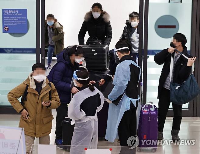 (영종도=연합뉴스) 한종찬 기자 = 카자흐스탄 알마티에서 벌어진 반정부 유혈 시위로 현지 공항에 발이 묶였던 승객들이 13일 저녁 인천국제공항을 통해 입국하고 있다. 2022.1.13