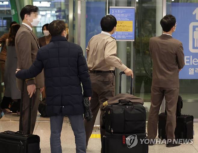 (영종도=연합뉴스) 한종찬 기자 = 카자흐스탄 알마티에서 벌어진 반정부 유혈 시위로 현지 공항에 발이 묶였던 승무원들이 13일 저녁 인천국제공항을 통해 입국하고 있다. 2022.1.13