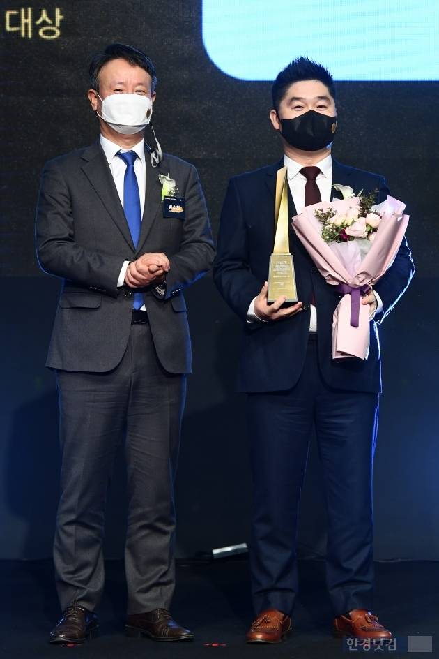 디지털 액세서리 부문을 수상한 엑토(브랜드명 엑토) 홍길선 차장(오른쪽)과 김수찬 한국경제신문 사업국장이 포즈를 취하고 있다.