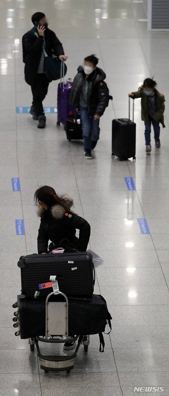 [인천공항=뉴시스] 백동현 기자 = 대규모 반정부 시위가 일어난 카자흐스탄 알마티에 발이 묶였던 아시아나 항공 승객들이 13일 오후 인천국제공항을 통해 귀국하고 있다. 2022.01.13. livertrent@newsis.com