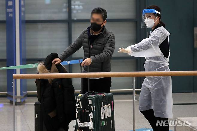 [인천공항=뉴시스] 백동현 기자 = 대규모 반정부 시위가 일어난 카자흐스탄 알마티에 발이 묶였던 아시아나 항공 승객이 13일 오후 인천국제공항을 통해 귀국하고 있다. 2022.01.13. livertrent@newsis.com