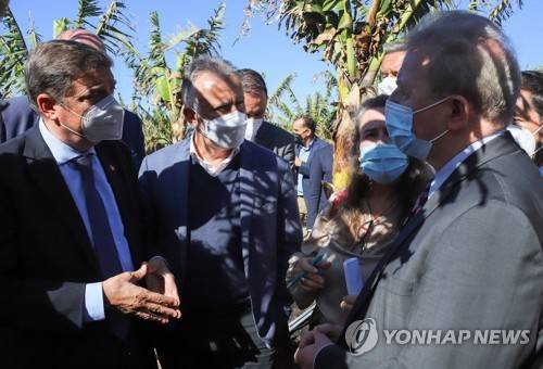 epa09682795 European Commissioner in charge of Agriculture Janusz Wojciechowski (R), chats with Spanish Minister of Agriculture, Luis Planas (L), during their visit to a banana plantation affected by the eruption of La Palma's volcano, in La Palma, Canary islands, Spain, 13 January 2022. EPA/Luis G. Morera
