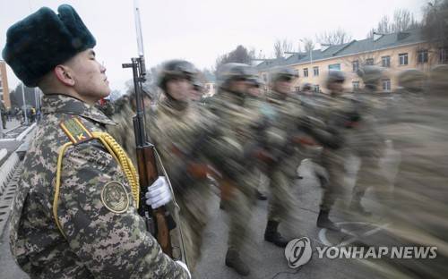 epa09682777 Kazakh servicemen attend the ceremony marking the beginning of the withdrawal of peacekeeping troops of the Collective Security Treaty Organisation (CSTO) from Kazakhstan in Almaty, Kazakhstan, 13 January 2022. In accordance with the decision of the CSTO Collective Security Council adopted on 06 January 2022, the collective peacekeeping forces of the Collective Security Treaty Organization (CSTO) have been sent 'for a limited time to stabilize and normalize the situation to Kazakhstan' at the request of the Kazakh president. They include units of the Armed Forces of Russia, Belarus, Armenia, Tajikistan and Kyrgyzstan. The Russian Ministry of Defence announced on 08 January that the tranfer of the Russian contingent of the CSTO peacekeeping forces to Kazakhstan's 'Almaty' and 'Zhitygen' airfields continued by military transport aircraft from Russia's airfields in the Moscow, Ivanovo, and Ulyanovsk regions. EPA/STR