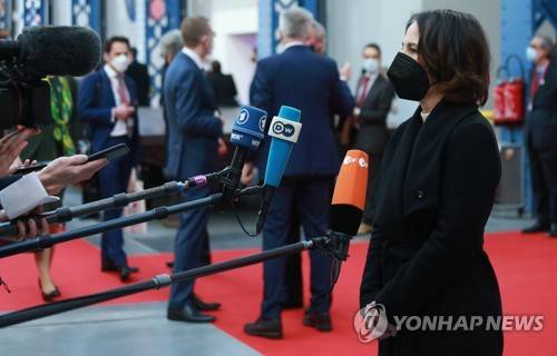 epa09682681 German Federal Foreign Minister Annalena Baerbock speaks to the media ahead of an informal meeting of EU Foreign Affairs Ministers dubbed the 'Gymnich' meeting in Brest, France, 13 January 2022. EPA/CHRISTOPHE PETIT TESSON