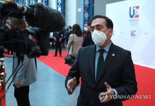 epa09682683 Spanish Foreign Affairs Minister Jose Manuel Albares speaks to the media ahead of an informal meeting of EU Foreign Affairs Ministers dubbed the 'Gymnich' meeting in Brest, France, 13 January 2022. EPA/CHRISTOPHE PETIT TESSON