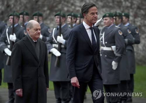 German Chancellor Olaf Scholz, left, welcomes the Prime Minister of the Netherlands, Mark Rutte, right, with military honors for a meeting at the chancellery in Berlin, Germany, Thursday, Jan. 13, 2022. (AP Photo/Michael Sohn)