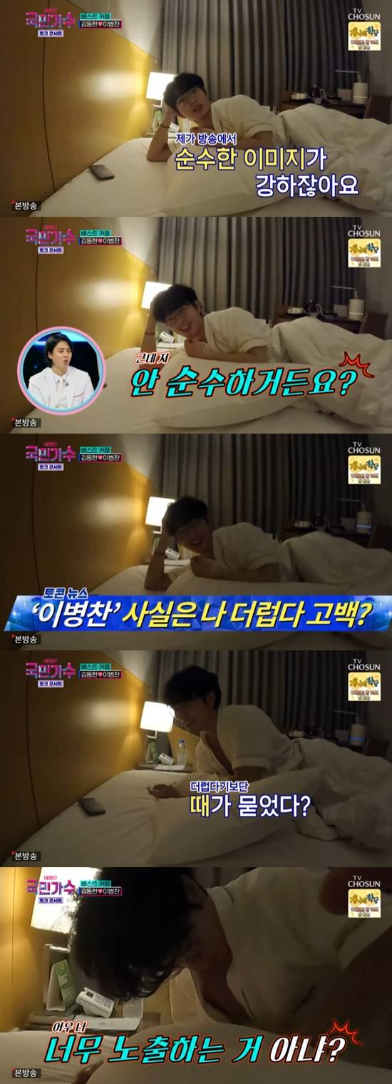 이어 이병찬은 김동현에게 "순수한 이미지가 강하지 않냐. 나는 안 순수하다"라고 고백했다. 김동현은 이병찬의 샤워 가운을 지적하며 "너무 노출하는 거 아니냐"고 말했다.