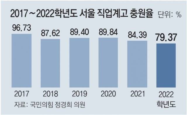서울 직업계고 신입생 충원율은 2018학년도 이후 계속 줄고 있다. 2017학년도에 96.73%를 기록한 뒤 2018학년도 87.62%, 2019학년도 89.40%, 2020학년도 89.84%에 이어 2021학년도 84.38%로 떨어졌다.