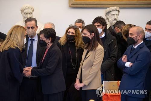 epa09683306 Roberta Metsola, who became interim president of the EU parliament, expresses condolences to the wife of the president of the EU parliament David Sassoli, Alessandra Vittorini, and to his children, Livia and Giulio, in the funeral home set up in Rome's City Hall, in Rome, Italy, 13 January 2022. European Parliament President David Sassoli died on 11 January, aged 65. EPA/MAURIZIO BRAMBATTI