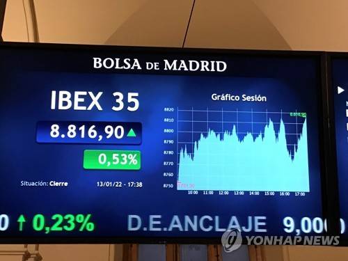 epa09683297 View of the Ibex 35, the main index of the Spanish Stock Exchange of Madrid, Spain, 13 January 2022, that has closed with a rise of 0.53 per cent over the 8,800 points. EPA/Vega Alonso del Val