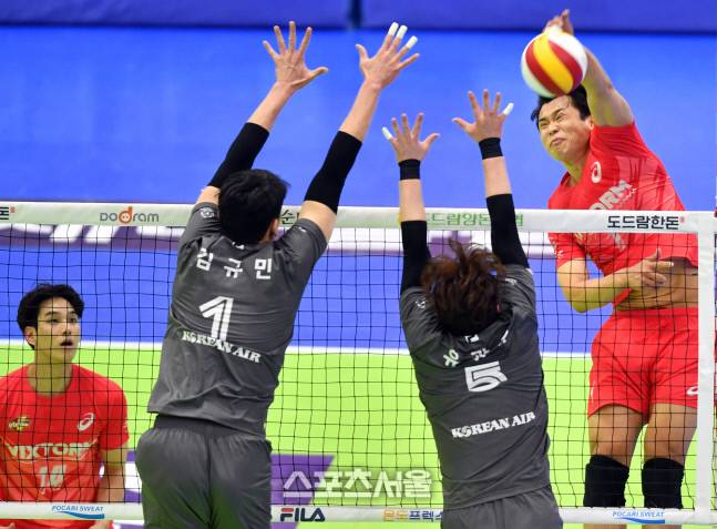 한전 서재덕이 13일 수원체육관에서 열린 2021-22프로배구 남자부 한국전력과 대한항공의 경기에서 대한항공 이중블로킹에 강타를 터트리고 있다.2022.01.13.