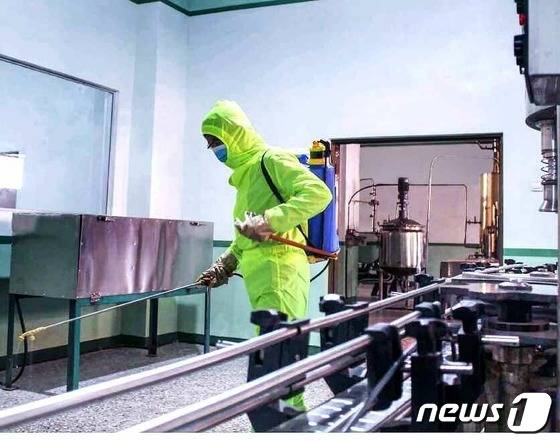 (평양 노동신문=뉴스1) = 북한 노동당 기관지 노동신문은 14일 신종 코로나바이러스 감염증(코로나19)에 대한 비상방역전을 더욱 공세적으로 벌이고 있다고 전했다. 사진은 정방산종합식료공장 내부 소독을 하고 있는 모습.