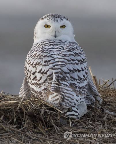 epa09683991 A Snowy Owl (Bubo scandiacus) sits in the dunes of Duxbury Beach in Duxbury, Massachusetts, USA, 13 January 2022. Every year from November to April, the Snowy Owl migrates from the Arctic Circle southward, and several have made Duxbury Beach their winter destination. EPA/CJ GUNTHER