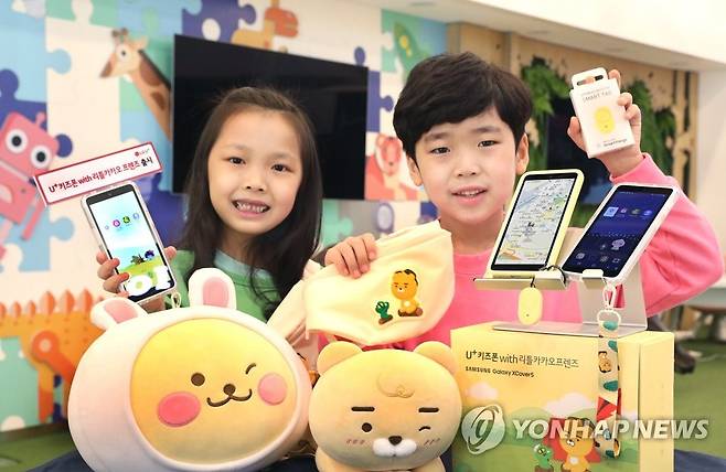 (서울=연합뉴스) LG유플러스가 자녀 안심 기능을 강화한 아동 전용 디바이스인 'U+키즈폰 with 리틀카카오프렌즈'를 14일 출시했다. 사진은 LG유플러스 초등학생 모델이 'U+키즈폰 with 리틀카카오프렌즈'를 이용하고 있는 모습. 2022.1.14