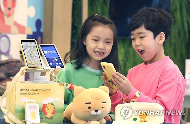 (서울=연합뉴스) LG유플러스가 자녀 안심 기능을 강화한 아동 전용 디바이스인 'U+키즈폰 with 리틀카카오프렌즈'를 14일 출시했다. 사진은 LG유플러스 초등학생 모델이 'U+키즈폰 with 리틀카카오프렌즈'를 이용하고 있는 모습. 2022.1.14