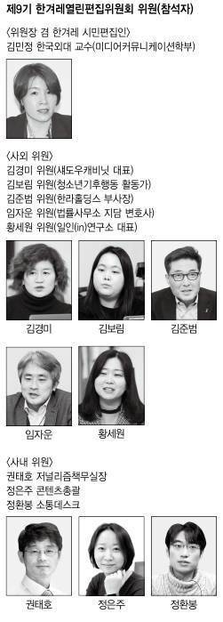 김민정 오늘이 9기 열린편집위원회의 마지막 회의다. 한겨레가 늘 열린편집위원회의 의견을 경청하고 고민하는 것이 느껴져 보람찬 1년이었다. 마무리한다고 하니 아쉬운 마음이 크지만 내일은 편하게 신문을 볼 수 있겠다 싶어 마음이 한편으로는 가벼워진다. 애정과 열정을 가지고 회의에 함께해주신 위원들께 모두 감사하다.