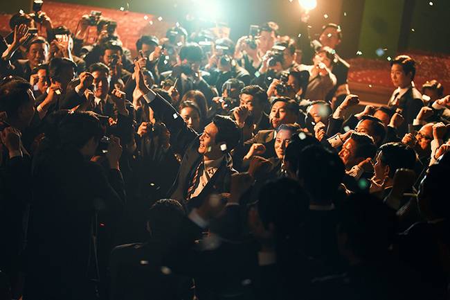 한편, '킹메이커'의 또 다른 관람 포인트는 단연 독보적인 미장센이다. 변성현 감독의 전작은 제70회 칸 국제 영화제에 초청돼 호평받은 '불한당: 나쁜 놈들의 세상'으로, 영화를 통해 보여준 감각적이고 세련된 미장센은 자연스럽게 '킹메이커'에 대한 기대로 이어졌다. 제작진은 1960-70년대 선거판을 특색 있게 담아 내기 위해 촬영과 조명 등에 심혈을 기울였으며, 조명을 활용해 캐릭터의 특성을 강조하기도 했다. 뿐만 아니라 시대적 느낌을 살리기 위해 빈티지 렌즈를 이용해 촬영을 진행했고, 가급적 시대에 맞는 필터들을 사용하려고 노력했으며, 장면에 따라 8mm 필름으로 찍은 장면을 넣음으로써 과거의 일을 진정성 있게 전하고자 했다. 실제 '불한당: 나쁜 놈들의 세상'에 이어 '킹메이커'에 참여한 한아름 미술 감독은 “촬영, 조명 등 여러 면에서 공을 들여 다른 영화에서 볼 수 없었던 볼거리들이 있다. 특히 연설신이나 경선신 등 정체적으로 미장센 완성도가 높은 장면들이 많다”라고 말해 '킹메이커'만의 독보적이고 특색 있는 미장센을 기대하게 만든다.(사진=메가박스중앙㈜플러스엠 제공)
