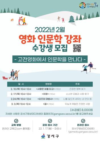 영화와 인문학에 관심 있는 주민이면 누구나 오는 17일부터 강서구영상미디어센터 누리집에서 신청할 수 있다. 25명을 선착순 모집하며 수강료는 8천 원이다.