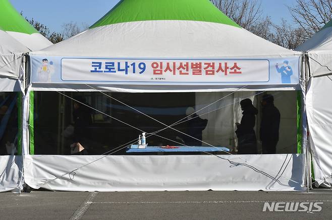 [대구=뉴시스] 이무열 기자 = 14일 오전 대구 수성구 대구스타디움 제3주차장에 마련된 임시선별검사소에서 시민들이 코로나19 진단검사를 받기 위해 순서를 기다리고 있다. 2022.01.14. lmy@newsis.com