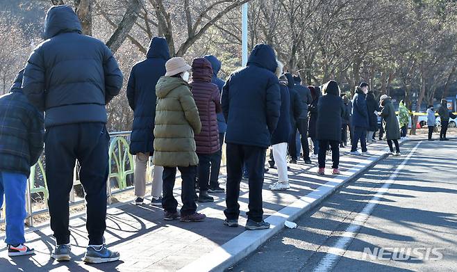 [대구=뉴시스] 이무열 기자 = 14일 오전 대구 수성구 대구스타디움 제3주차장에 마련된 임시선별검사소에서 시민들이 코로나19 진단검사를 받기 위해 순서를 기다리고 있다. 2022.01.14. lmy@newsis.com