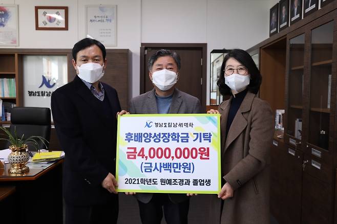 경남도립남해대학(총장 조현명) 원예조경과 졸업생 후배사랑장학금 400만원을 지난 12일 남해대학에 기탁했다.