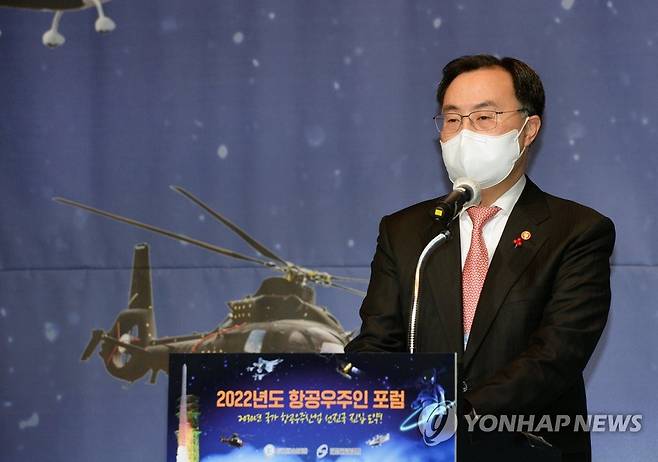 (서울=연합뉴스) 문승욱 산업통상자원부 장관이 14일 서울 메리어트호텔 그랜드볼룸에서 우주·항공분야 산학연 관계자 150여명이 참석한 가운데 열린 '2022년 항공우주인 포럼(신년인사회)'에 참석해 축사하고 있다. 2022.1.14