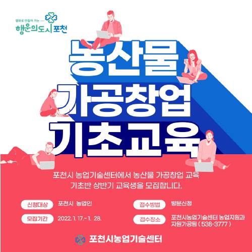 포천시, 농산물가공 창업교육 기초반 교육생 모집