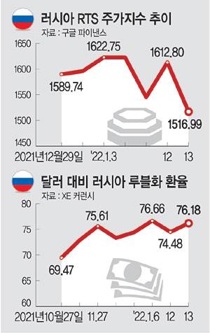 미국, 나토(북대서양조약기구)와 러시아 간 회담에 이어 13일 유럽안보협력기구(OSCE)회의도 빈손으로 끝나면서 우크라이나를 둘러싼 군사적 긴장이 오히려 더 고조되고 있다. “전쟁의 북소리가 크게 들리고 있다”면서 전쟁 발발 가능성을 우려하는 목소리가 커지고 있는 가운데, 러시아는 중남미의 쿠바·베네수엘라에까지 군사 배치 가능성을 언급하면서 서방을 강하게 압박하고 있다. 미국이 “단호한 대응”을 천명하고 나서면서 전쟁 우려가 커지자 러시아의 주요 경제지표들은 이날 일제히 하락했다.