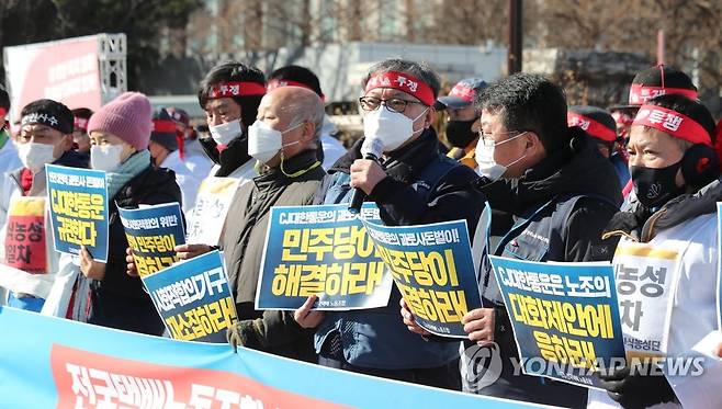 (서울=연합뉴스) 류효림 기자 = 14일 오후 서울 여의도 국회 앞에서 열린 전국택배노조 100인 단식 농성 돌입 기자회견에서 발언하고 있다. 2022.1.14
