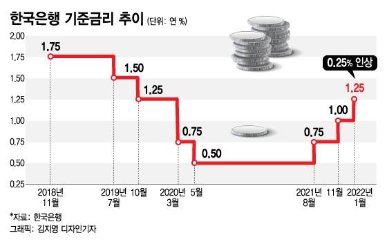 한국은행 금융통화위원회는 14일 연 1%였던 기준금리를 1.25%로 0.25%포인트 인상했다. 기준금리는 코로나19 시대 들어 9차례 동결됐다가 지난해 8월 0.25%포인트, 이어 지난해 11월 0.25%포인트 올랐다. 몇 달 사이 추가 인상이 이어지면서 기준금리는 코로나19 이전 수준으로 돌아갔다. 시장에서는 기준금리가 연내 두 차례 정도 추가 인상될 가능성에 무게를 둔다.