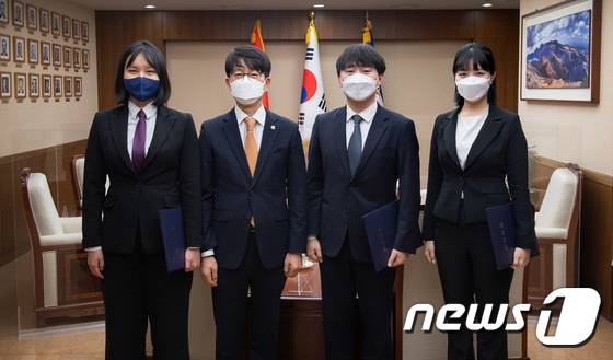 (서울=뉴스1) = 14일 서울 용산구 국방부에서 열린 병영혁신 청년자문위원 위촉식에서 김지은 위원(왼쪽부터), 박재민 국방부차관, 박현민 위원, 강보라 위원이 기념촬영을 하고 있다. (국방부 제공) 2022.1.14/뉴스1