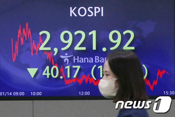 (서울=뉴스1) 민경석 기자 = 14일 오후 서울 중구 하나은행 딜링룸 전광판에 코스피 지수가 전일 대비 40.17P(1.36%) 하락한 2,921.92를 나타내고 있다.
