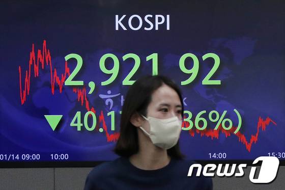 (서울=뉴스1) 민경석 기자 = 14일 오후 서울 중구 하나은행 딜링룸 전광판에 코스피 지수가 전일 대비 40.17P(1.36%) 하락한 2,921.92를 나타내고 있다.