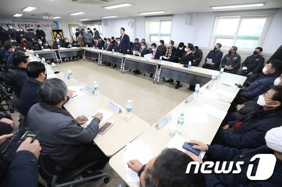 (창원=뉴스1) 구윤성 기자 = 윤석열 국민의힘 대선 후보가 14일 오후 경남 창원시 봉암공단회관에서 열린 봉암공단 기업협의회 간담회에 참석해 발언하고 있다. 2022.1.14/뉴스1