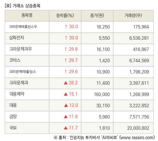[fnRASSI]장마감, 거래소 상승 종목(크라운해태홀딩스우 30.0% ↑)