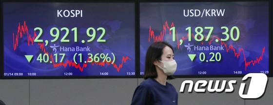 (서울=뉴스1) 민경석 기자 = 14일 오후 서울 중구 하나은행 딜링룸 전광판에 코스피 지수가 전일 대비 40.17P(1.36%) 하락한 2,921.92를, 원·달러 환율은 0.20원 하락한 1,187.30원을 나타내고 있다.