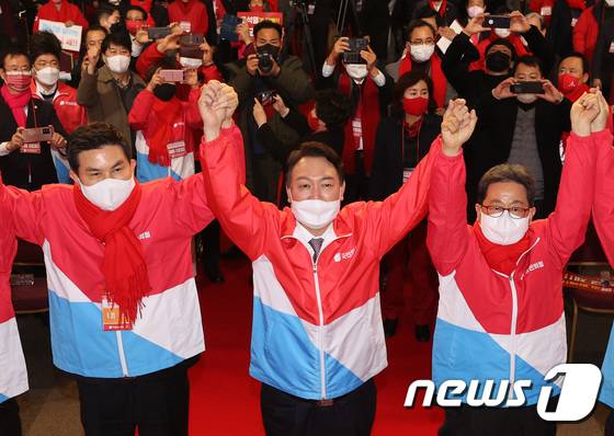 (창원=뉴스1) 구윤성 기자 = 윤석열 국민의힘 대선 후보가 14일 오후 경남 창원시 창원컨벤션센터에서 열린 국민의힘 경남선대위 '필승 결의대회'에 참석해 대선 승리를 다짐하며 두 팔을 들어보이고 있다. 2022.1.14/뉴스1