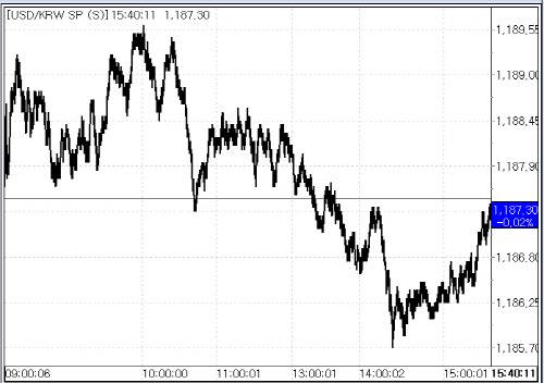 14일 서울외국환중개에 따르면 원·달러 환율은 이날 전 거래일 종가(1187.50원)보다 0.20원 하락한 1187.30원에 마감했다. 전날에 이어 1180원대에서 등락하며 닷새째 하락했다. 이날 환율은 전일 대비 0.50원 오른 1188.00원에 출발해 장중 한 때 1189.50원까지 올랐으나 오후들어 하락 반전했다. 오후 장중 한 때는 1185.60원까지 내렸으나 장 마감 직전 낙폭을 반납하고 약보합권에서 장을 마쳤다.