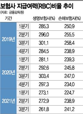 한편 최근 보험사의 RBC 비율은 금리상승, 주가하락 등으로 하락추세를 보이고 있다. 작년 3분기 기준 국내 보험사 평균 RBC 비율은 전분기 말보다 6.4%포인트 하락한 254.5%로 나타났다.