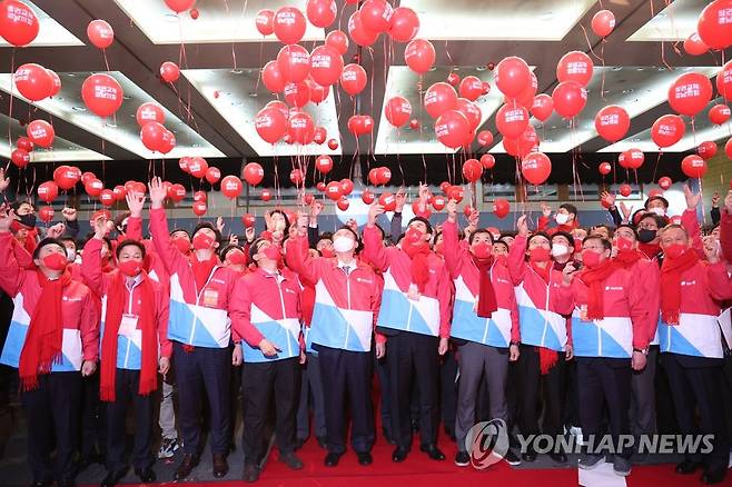 (창원=연합뉴스) 이정훈 기자 = 국민의힘 윤석열 대선 후보가 14일 오후 경남 창원시 성산구 창원컨벤션센터에서 열린 경남 선대위 필승결의대회에서 참석자들과 함께 정권교체의 염원을 담은 풍선을 날리고 있다. 2022.1.14