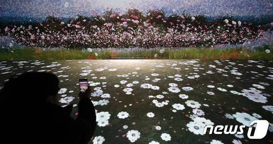 (서울=뉴스1) 권현진 기자 = 14일 서울 종로구 경복궁역 서울메트로미술관에서 열린 '광화시대' 전시장 내 도심 속 미디어 정원 '광화원'에서 시민들이 작품을 감상하고 있다. 2022.1.14/뉴스1