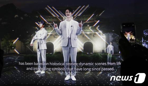 (서울=뉴스1) 권현진 기자 = 14일 서울 종로구 경복궁역 서울메트로미술관에서 열린 '광화시대' 전시장 내 광화인 인공지는 인포메이션 센터를 찾은 시민이 샤이니 민호가 전하는 한국의 문화유산 소개를 듣고 있다. 2022.1.14/뉴스1