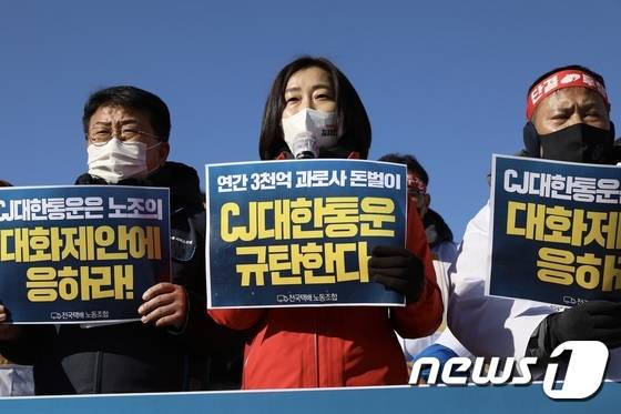 (서울=뉴스1) = 김재연 진보당 대선후보가 14일 서울 여의도 국회 앞에서 열린 전국택배노동조합 100인 단식 돌입 기자회견에 참가해 피켓을 들어보이고 있다. (진보당 제공) 2022.1.14/뉴스1