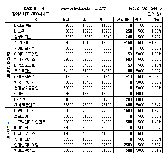 보로노이(6만6000원), 이지트로닉스(4만1000원), 퓨쳐메디신(2만원), 바디프랜드(1만1500원), 현대카드(1만3000원), 에스바이오메딕스(9500원), 엔쓰리엔(870원), 지아이이노베이션(3만9000원) 등 장외종목은 주가변동없이 장을 마감했다.