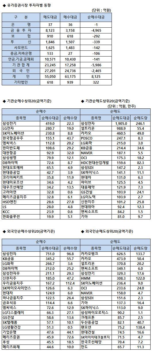 [표]코스피 기관/외국인 매매동향(1/14 3시30분)