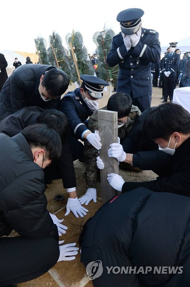 (대전=연합뉴스) 김준범 기자 = 공군 F-5E 전투기 추락사고로 순직한 고(故) 심정민 소령(29·공사 64기·추서 계급)의 안장식이 14일 오후 국립대전현청원에서 열린 가운데 동료들이 고인과 마지막 인사를 하고 있다. 2022.1.14 [공동취재]