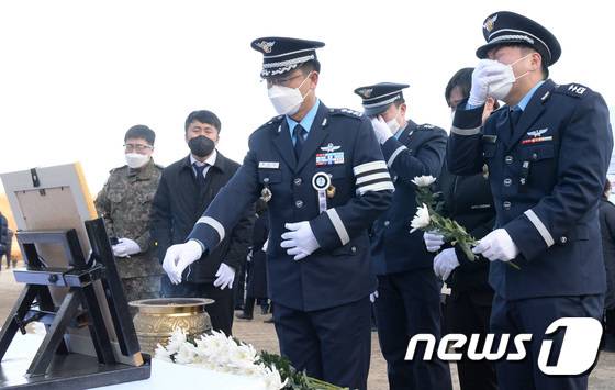 (대전=뉴스1) 김기태 기자 = 공군 KF-5E 전투기 추락사고로 순직한 고(故) 심정민 소령(29·공사 64기·추서 계급)의 안장식이 14일 국립대전현충원에서 엄수되고 있다. 2022.1.14/뉴스1