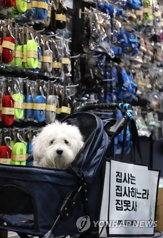 (서울=연합뉴스) 류효림 기자 = 14일 서울 강남구 대치동 세텍(SETEC) 전시장에서 열린 마이펫페어 2022에서 관람객들이 반려견과 함께 반려동물 용품과 제품들을 둘러보고 있다. 2022.1.14